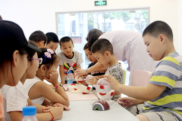 其次是老师让小朋友对眼球的模型进行组装,考验大家的动手能力。每个小朋友都对组装十分感兴趣,每组成员齐心协力,共同完成了眼球模型的组装。
